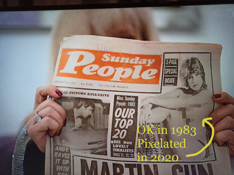 ...in 1983 it was acceptable to put 16 year old Sam Fox on the front cover of a major Sunday newspaper. Miss Fox was a 16 year old schoolgirl at the time, so the newspaper could legitimately display her naked breasts to their readership, but to show the same picture on TV in 2020 invites prosecution.