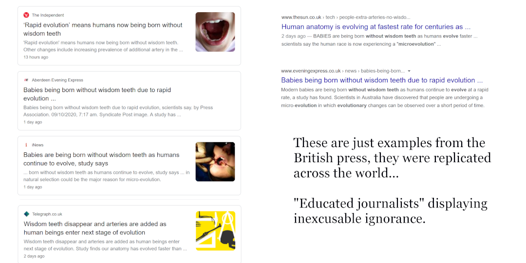 The illustration below shows newspaper headlines from around the world reporting on an alleged claim by Australian scientists. Exactly what they claimed I have not bothered to check on, the source is said to be an article in the Journal of Anatomy with the lead author being Dr Teghan Lucas of Flinders University, Adalaide. (Who has hopefully been seriously mis-quoted).